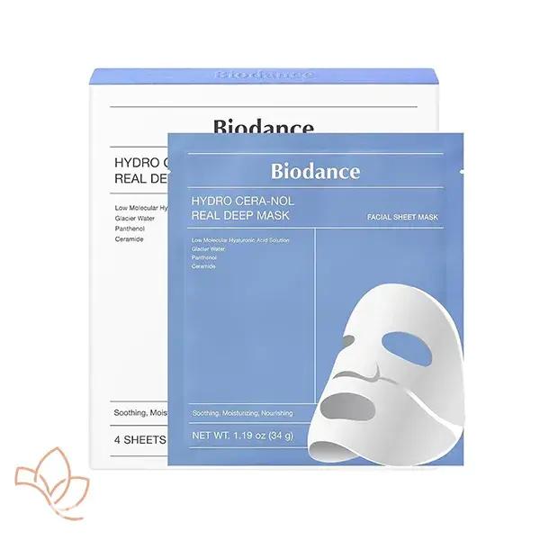ماسک بایودنس آبرسان هیالورونیک اسید ورقه ای مدل HYDRO CERA-NOL REAL DEEP MASK از برند بایودنس (Biodance) یک ماسک ورقه ای حرفه ای با فرمولاسیونی قوی از هیالورونیک اسید، سرامید، پانتنول و آب یخچالی است که به آبرسانی عمیق، کاهش التهاب و تقویت سد دفاعی پوست کمک می کند.