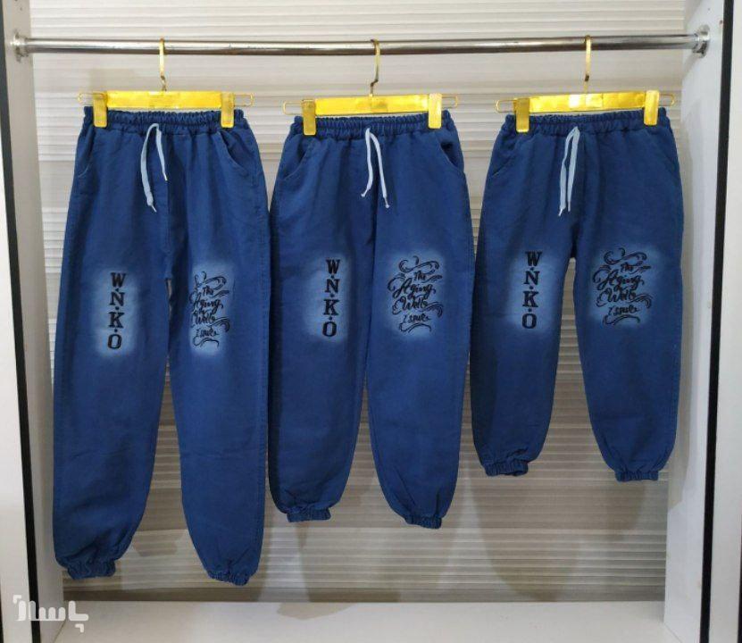 شلوار اسلش پسرانه سایز.بندی. تک رنگ .پارچه نیل .گلدوزی شده