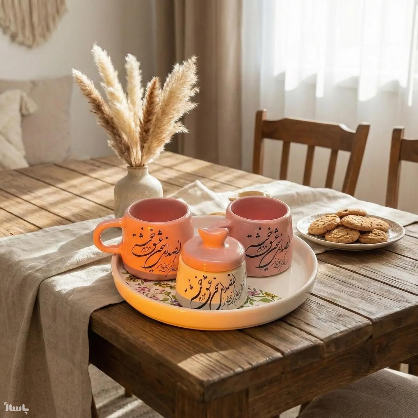طراحی سنتی-مدرن: این ست به زیبایی از خوشنویسی فارسی (احتمالا شعر) بر روی ماگ و شکرریز استفاده کرده و آن را با رنگ صورتی پاستلی ترکیب کرده است. این تلفیق، محصول را هم برای خانههای سنتی و هم برای دکوراسیونهای مدرن (با تم بوهو یا شیک) مناسب میسازد.