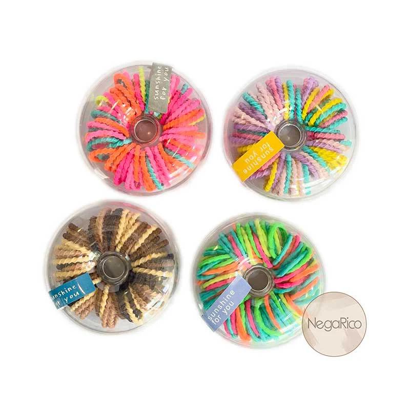 این کش موها در یک جعبه دوناتی هست که برای بچه ها خیلی جذابه وجنس کش ها خیلی بادوام وباکیفیت هست.تعداد کش ها 60 عدد هست . رنگ کش ها در چند رنگ مختلف و کاربردی که با هر لباسی میتونید ست کنید .