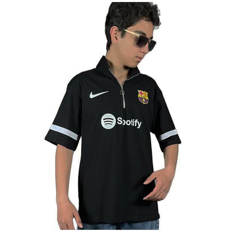 تیشرت آستین کوتاه یقه نیم زیپ طرح بارسلونا