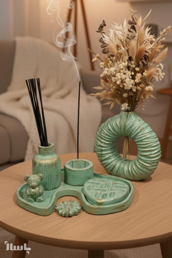 ست دکوری دستساز از سنگ مصنوعی با رنگ سبز سیج پتینهای، مناسب دکوراسیون منزل و فضاهای مدرن.