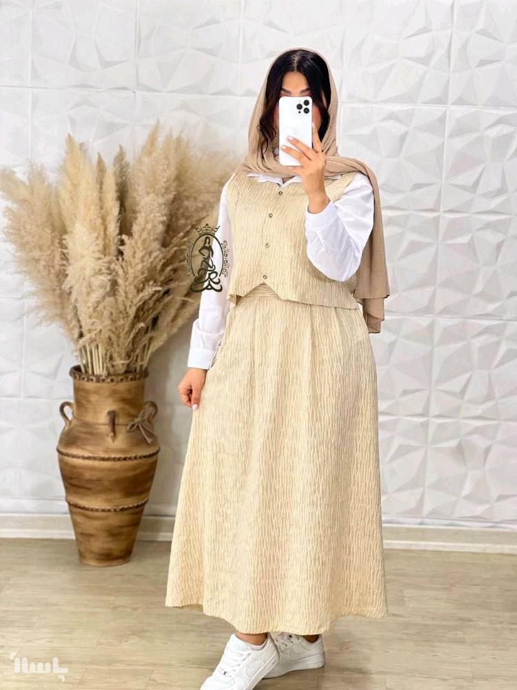 ️توضیحات :پارچه ابرفت و رنگدهی و پرزدهی نداره، لمه ها بدون ریزش هستن، پشت کمر دامن کش داره که سایزش تنظیم بشه، دکمه های شومیز و ژیله کاربردی هستن