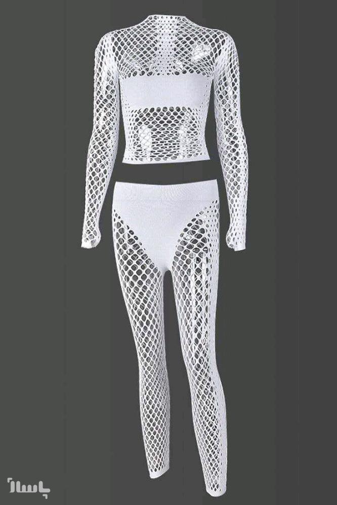 این ست شامل یک تاپ کراپ آستینبلند و لگینگ بلند، با طراحی منحصربهفرد و فیت کشی، از پارچه توری شبکهای و پنلهای اپاک سفید است. طراحی کاملا ترندی و چشمگیر این ست، جلوهای ویژه به فرم بدن میبخشد و بافت متفاوت و الگوی درشت تور، باعث میشود هر حرکت و ژست بدن بهتر دیده شود.