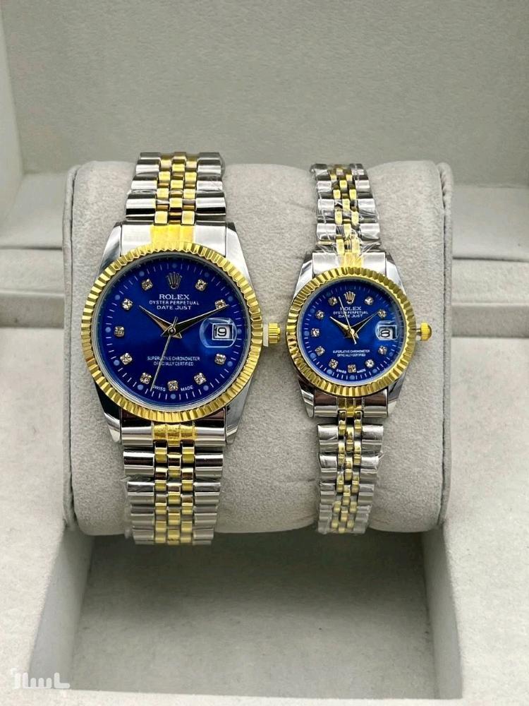 ست ساعت رولکس زنانه و مردانه با هم بنداستیل دو رنگ نقره ای طلایی صفحه آبی
