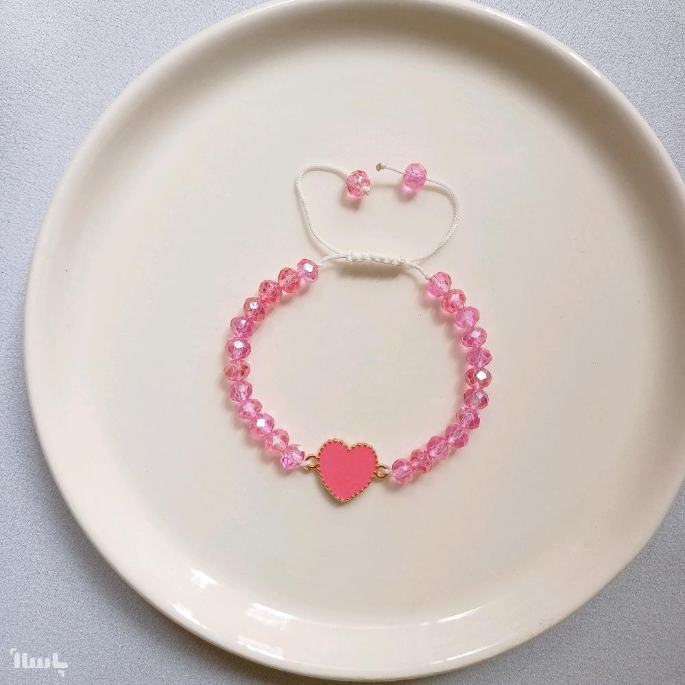دستبند زنانه کریستالی صورتی طرح قلب بافت کشویی