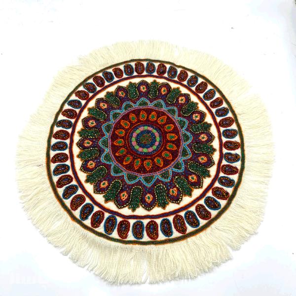 رومیزی پته دوزی گرد رنگ سفید مدل جقه 45 سانتی