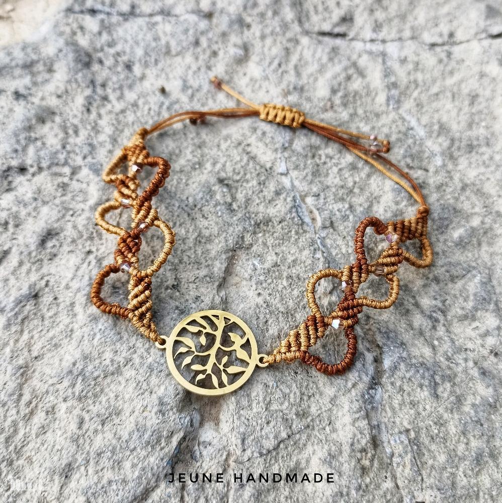 دستبند بافت با پلاک استیل طلایی و گره کشویی.