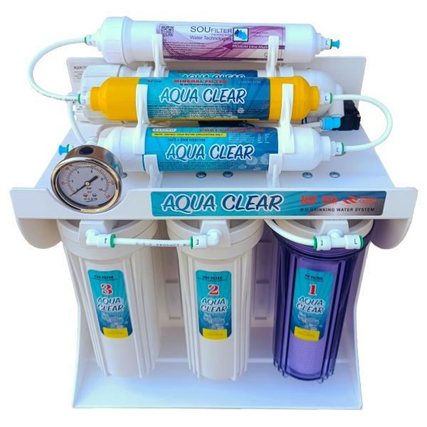 در این دستگاه تصفیه کننده آب خانگی از پمپ مگابوستر فشار قوی و بی صدا aqua clear ، شیر برداشت اهرمی زیبا و منحصر بفرد و فیلتر ممبران (RO) استفاده شده است.