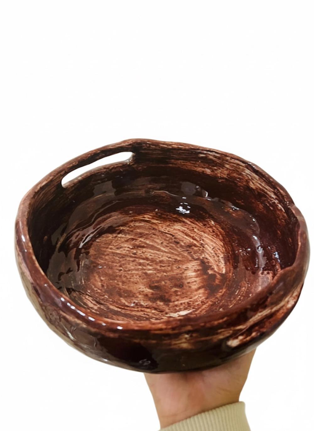 یک اثر کاملا دستساز است که با عشق، دقت و صبر شکل گرفته؛ اثری که رد انگشتهای هنرمند و روح خلاقیت در تمام خطوطش قابل لمس است. رنگآمیزی این کاسه با طیف دلنشینی از قهوهای شکلاتی براق اجرا شده که زیر نور برق خاصی ایجاد میکند و حالوهوایی گرم، صمیمی و اصیل به آن میبخشد.