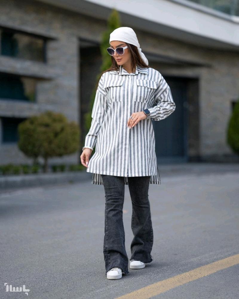 مانتو اسپرت زنانه الیاف مدل جنس کراش راه راه دکمه ای