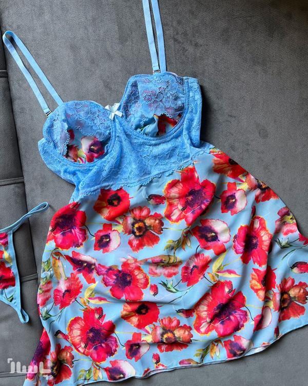 گلهای زیبای شقایق در زمینه آبی پارچه حریر تصویری رویایی از لباس رو به نمایش گذاشته که بر تن خودنمایی میکنه و دلبری ها داره. هر چقدر از شیکی این لباس بگم کمه