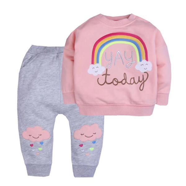 طرح ست بلوز شلوار دخترانه، یک رنگین کمان زیبا با ابر روی سینه و روی زانوها دو ابر فانتزی درج شده و دمپا و سرآستین ها و یقه و پایین لباس کشی است.