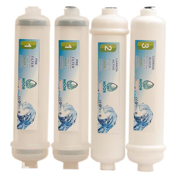 شامل دو عدد فیلتر P.P LINE که یکی از ارزانترین و پر مصرفترین فیلترهای دستگاه تصفیه آب خانگی است و در دستگاههای حوزینگدار قابل استفاده نمیباشد و برای دستگاههای خطی ( LINE , INLINE ) استفاده میگردد. جنس این فیلتر از الیاف پلی پروپیلن است و وظیفه این فیلتر حذف ذرات معلق ( شن، ماسه، گل و لای، زنگ آهن، گچ و….) از آب به قطر 5 میکرون میباشد. تعویض به موقع این فیلتر سبب جلوگیری از آسیب رسیدن به قطعات شیر برقی و پمپ دستگاه میشود. همچنین این فیلتر دارای مکانیزم هوشمند جلوگیری از برگشت آب میباشد، بنابراین باید هنگام نصب به جهت جریان مشخص شده توجه نمایید و نکتهی دیگری که حائز اهمیت است اندازه فیلتر میباشد که نسبت به نوع موجود در بازار بزرگتر است. مناسبترین زمان تعویض این فیلتر هر 3 ماه میباشد.