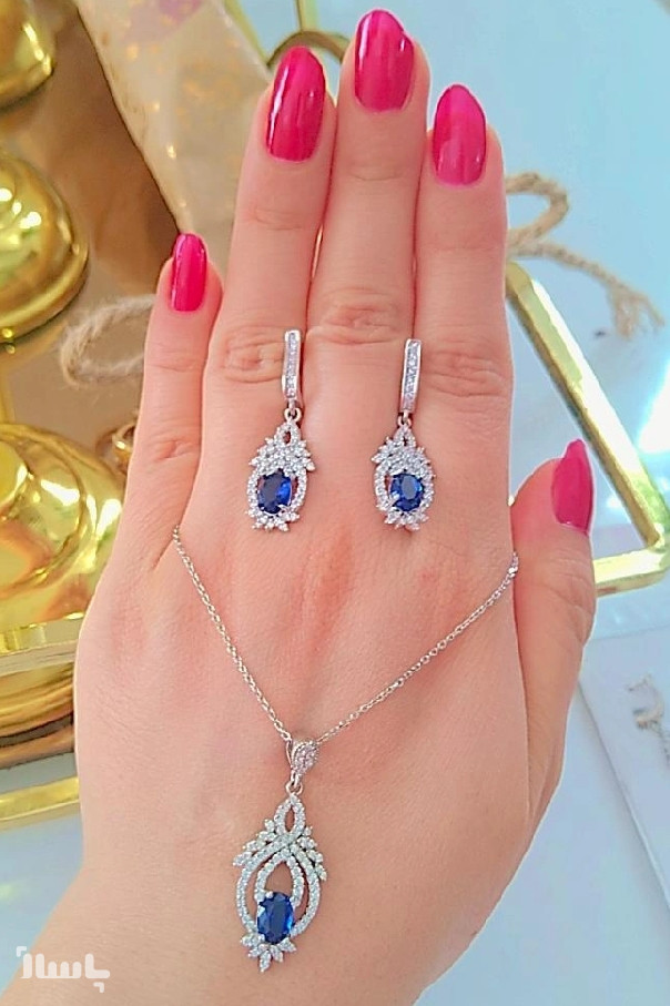 نیم ست نقره زنانه نگین کبود با آبکاری طلا سفید ضد حساسیت