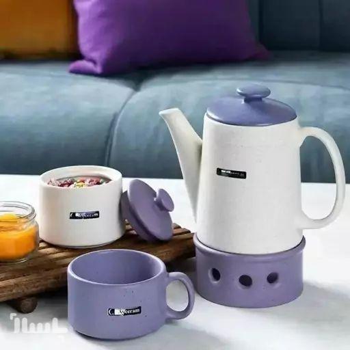 ️جنس و طراحی: این سرویس از سرامیک با کیفیت ساخته شده و دارای طراحی مدرن با ترکیب رنگهای آرامشبخش (مانند طوسی و بنفش) است. درب و دسته قوری و قندان به صورت ارگونومیک طراحی شدهاند تا استفاده از آنها راحت باشد.