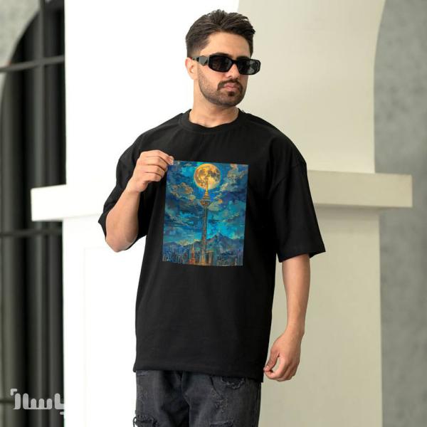 تیشرت قواره دار چاپی جنس پارچه نخ پنبه طرح چاپ برج میلاد تهران مشکی