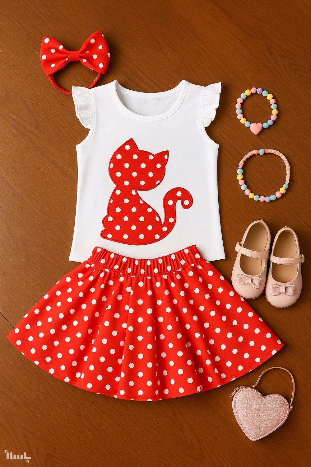 ست تاپ تیکه دوزی و دامن خالخالی دخترانه لباس تابستانی دخترانه