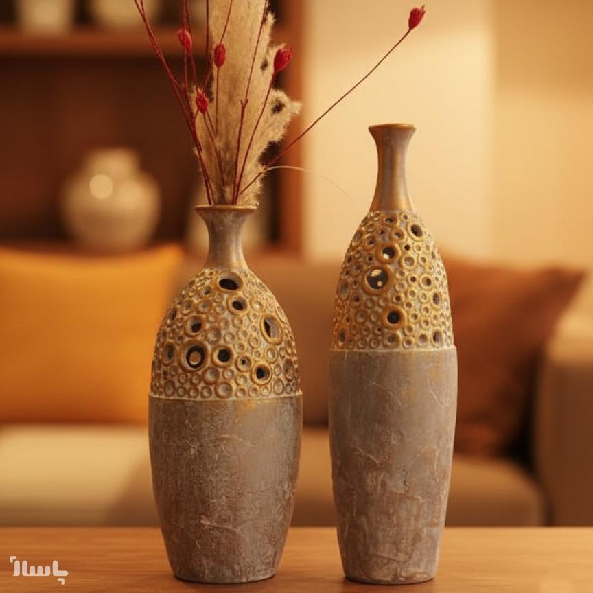 ست دوتایی با ارتفاعهای متفاوت: شامل دو گلدان با ابعاد متناسب که چیدمان حرفهای و هارمونی بصری را برای شما به ارمغان میآورد و برای قرارگیری روی شومینه، کنسول، یا میز پذیرایی ایدهآل است.