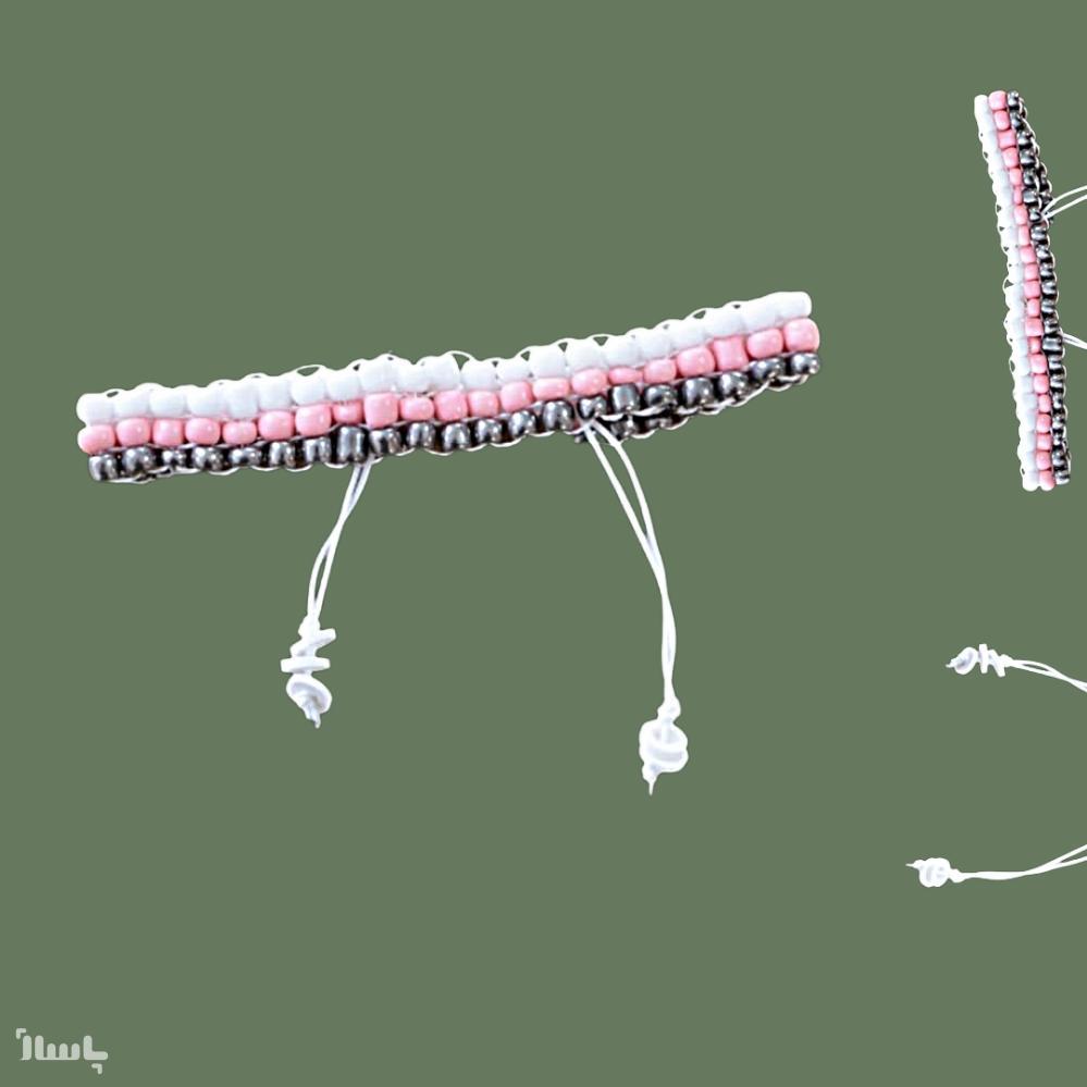 بافته شده با منجوق سفید و نقره ای و صورتی و نخ ضد حساسیت (منجوق دوزی)