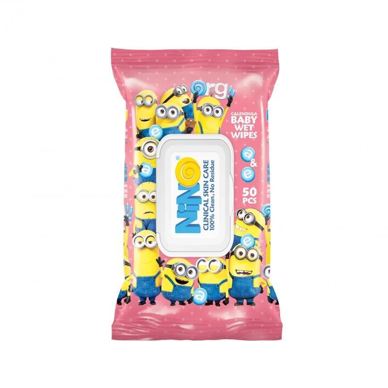دستمال مرطوب کودک حاوی کالاندولا 50 برگی صورتی مینیون درب دار نینو