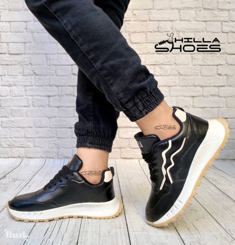 کتانی زنانه راحتی چرم مشکی لاین کرم مناسب پیاده روی