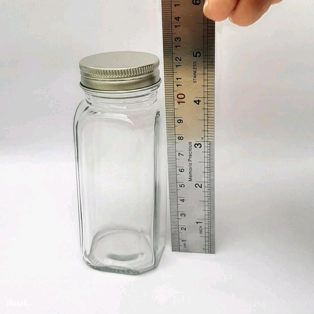 شیشه مکارتی چهار گوش با ارتفاع دوازده سانتی متر و ضلع چهار نیم سانتی متر مناسب 80 تا 100 گرم ادویه می باشد و درب این محصول به صورت پیچی می باشد