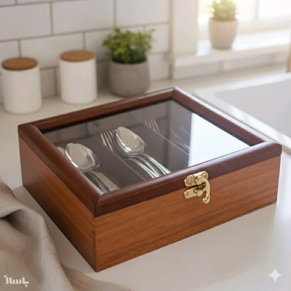 باکس قاشق و چنگال(کارد و چنگال) رومیزی،جنس چوب،درب شیشه،ابعاد 22×22