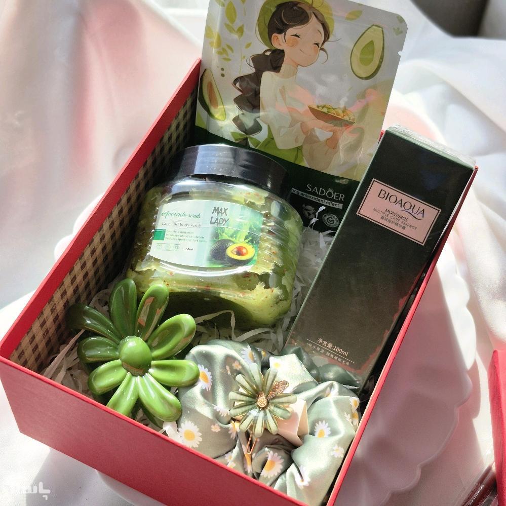 آیتم ها: سرم چای سبز،ماسک اوکادو،اسکراپ بدن،کلیپس گل،اسکرانچی،سنجاق مو ،باکس و پوشال