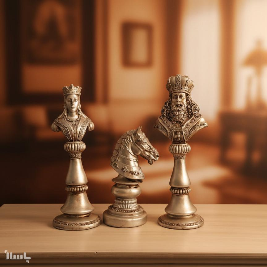این ست مجسمه سهتایی با الهام از بازی استراتژیک شطرنج، نمادی از قدرت، نجابت و هوش است. جزئیات دقیق و بافت سلطنتی این مجسمهها، آنها را به یک نقطه کانونی چشمگیر در فضای زندگی یا کار شما تبدیل میکند. این ست، شکوه و وقار سبکهای دکوراسیون کلاسیک، نئوکلاسیک و حتی گوتیک را به خوبی منعکس میکند.