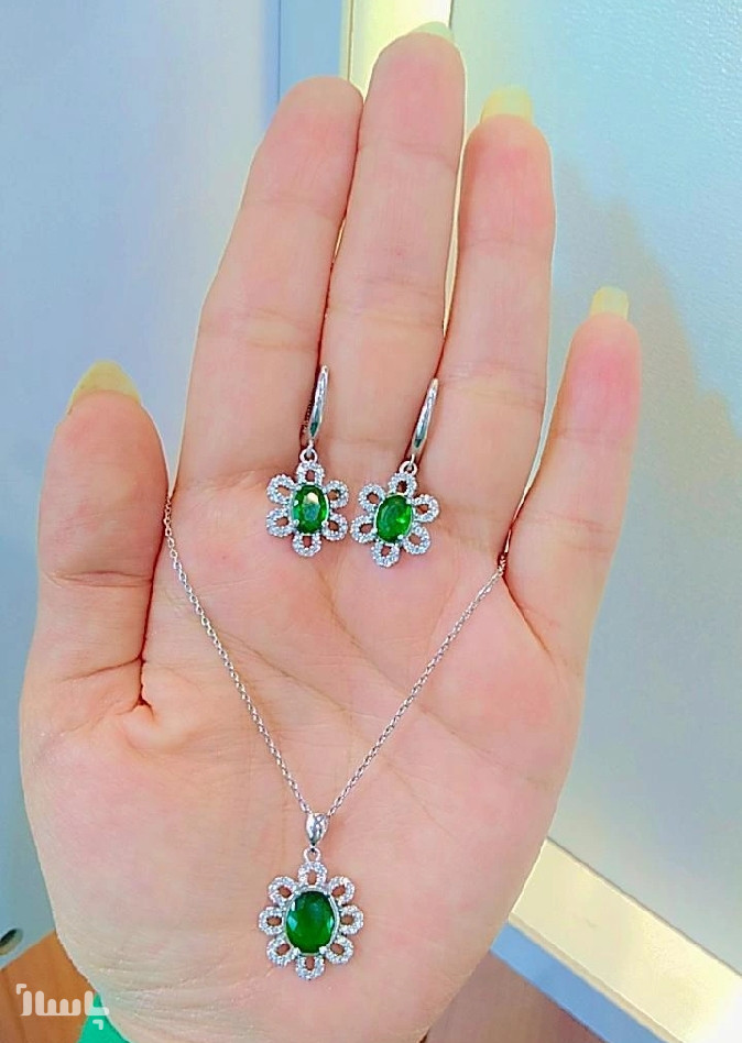 نیم ست نقره زنانه طرح گل زمردی با آبکاری طلا سفید