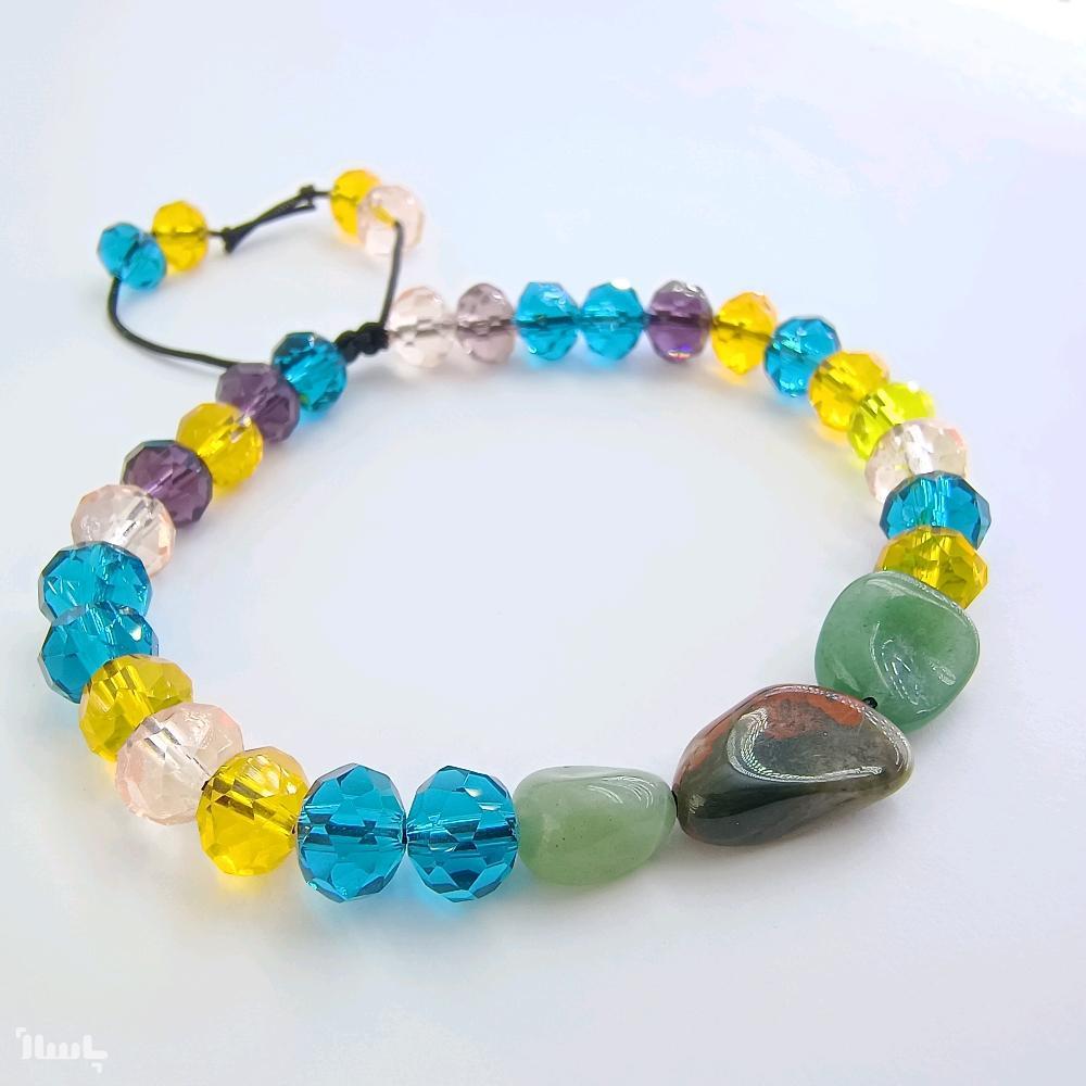 نام سنگ و مهره: عقیق ژاسپر و اونتورین سبز در مرکز و کریستال های رنگی رنگی در اطراف