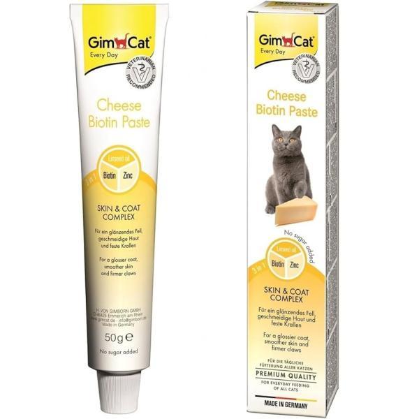 خمیر GimCat Cheese Biotin Paste ترکیبی منحصر به فرد از پنیر واقعی ایتالیایی، بیوتین، زینک (روی) و روغن بذر کتان است. طعم پنیر اصیل این محصول را برای گربهها بسیار خوشایند و قابل قبول میکند. ترکیب سهگانه بیوتین، زینک و روغن کتان، متابولیسم پوست و مو را بهبود بخشیده و باعث ایجاد موهایی سالمتر و درخشانتر، پوستی نرمتر و ناخنهایی قویتر میشود.