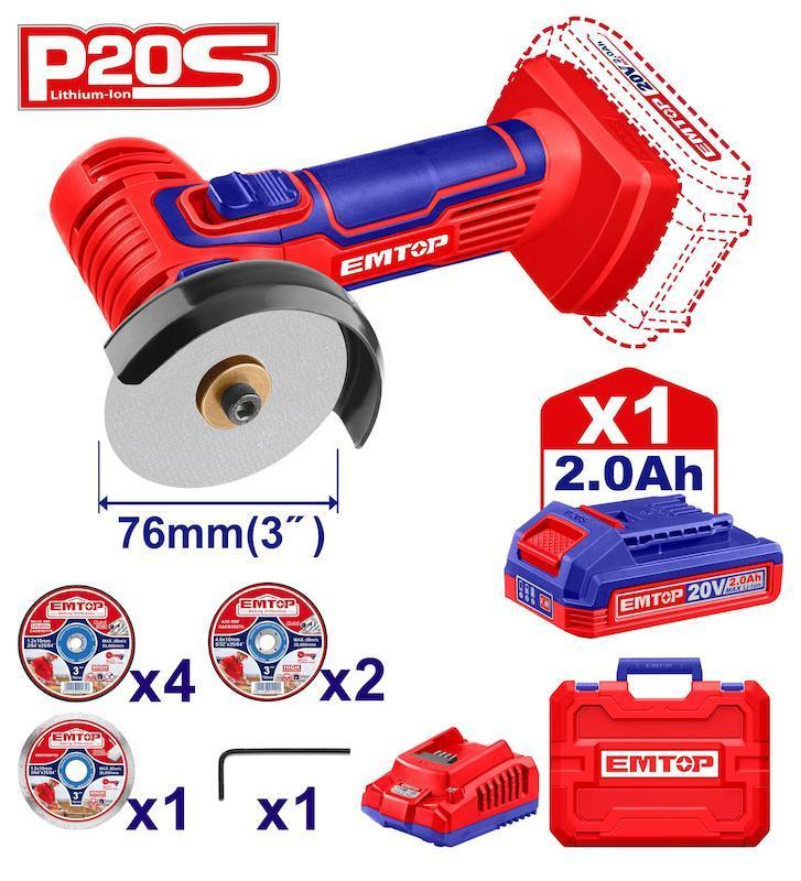 مینی فرز شارژی EMTOP ELAG76017 با ولتاژ 20 ولت، سرعت 19500 دور در دقیقه و صفحه 76 میلیمتری، ابزاری قدرتمند و کاربردی برای برش و ساب انواع فلزات است. این دستگاه به همراه باتری 2.0Ah، شارژر و مجموعهای کامل از دیسکهای برش و سایش عرضه میشود.