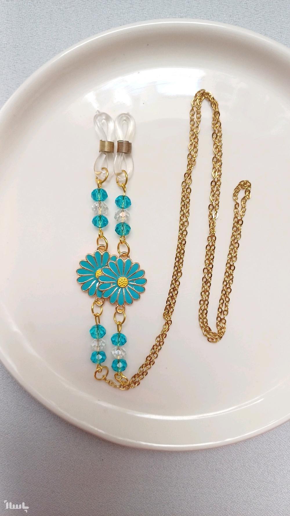 بند عینک زنجیری آبی فیروزه ای استیل مدل گل بابونه کریستالی