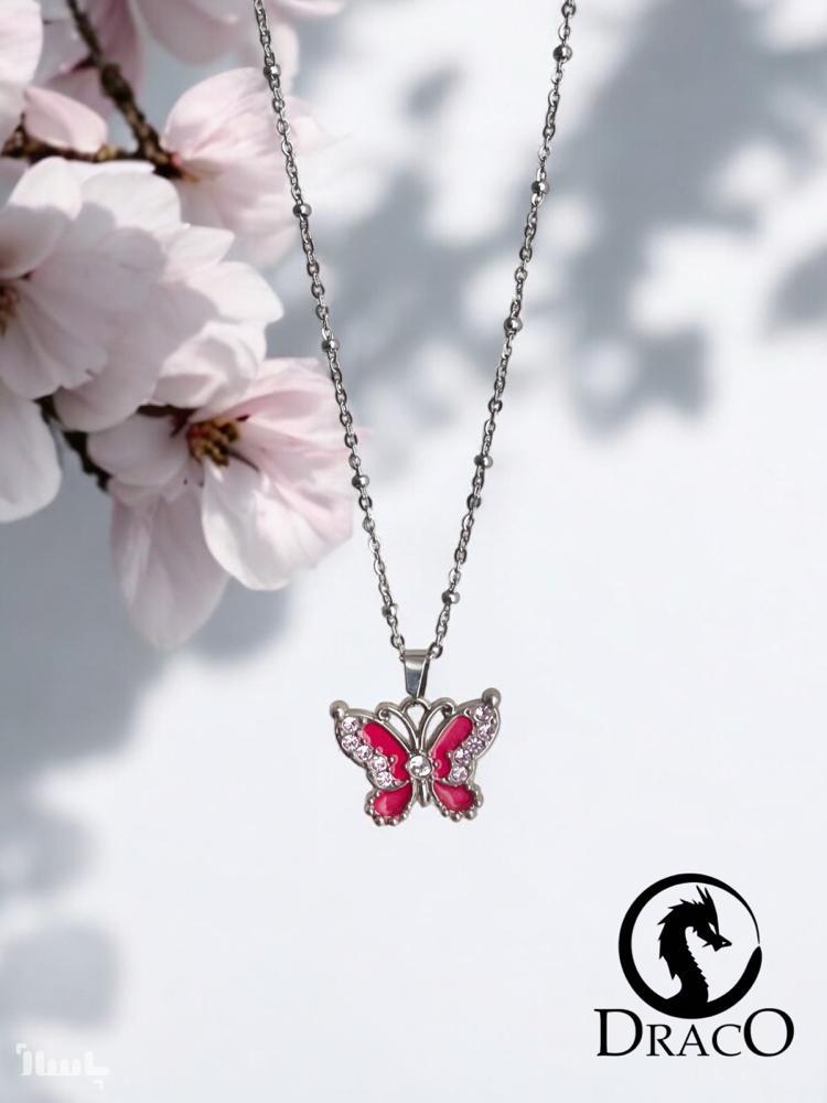 گردنبند زیبای پروانه صورتی مدل جواهری نگین دار