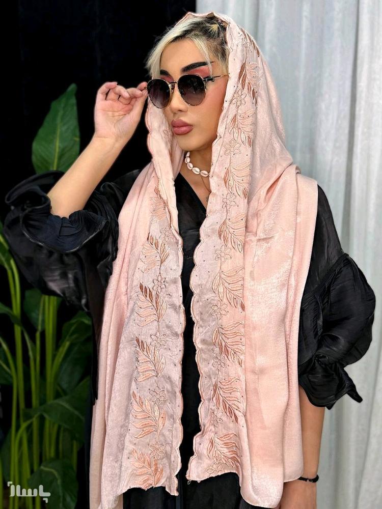 شال مجلسی کوپرا (کوپرا جنسی از ابریشم که بسیار مجلسیه و ایستایی خوبی روی سر داره) سرتاسر کار دارای گلدوزی برجسته چرخدوز که بسیار مقاومه