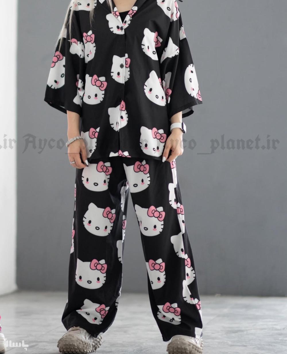 ست پیراهن و شلوار پیژامه راحتی هلو کیتی رنگ مشکی