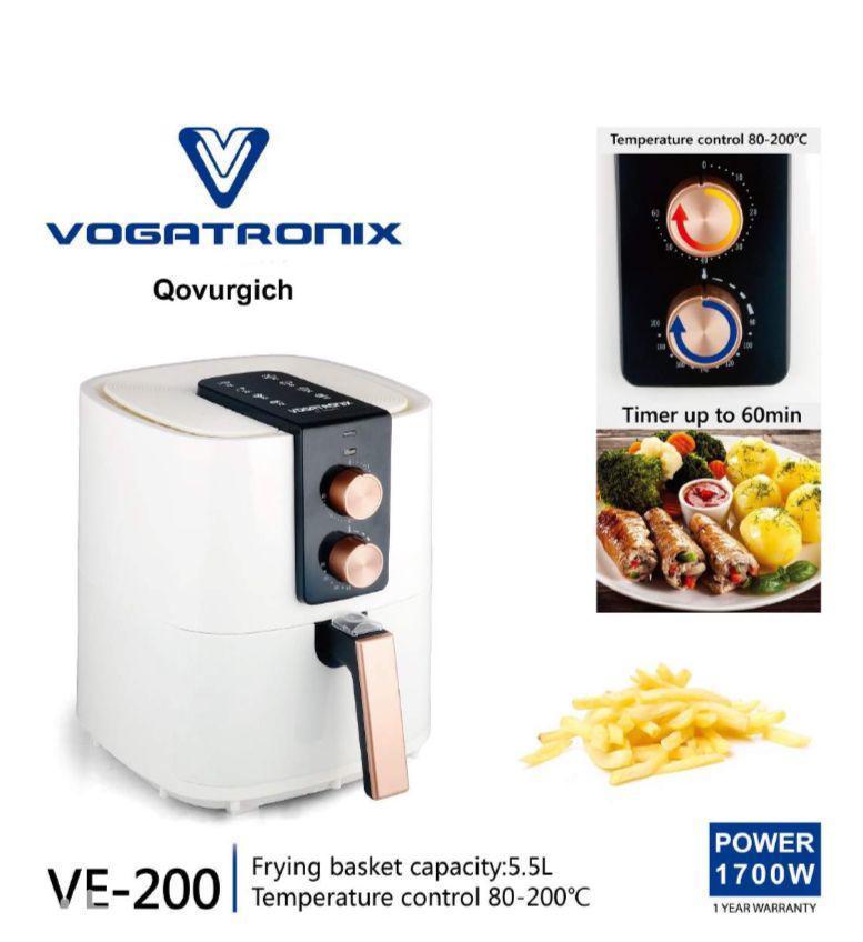 سرخ کن بدون روغن وگاترونیکس مدل VE 200 با ظرفیت مخزن 5.5 لیتر نیاز شما را برای سرخ کردن و تهیه غذاهای بدون روغن ، کم روغن و رژیمی برطرف می کند ، این سرخ کن قابلیت تنظیم دما و زمان برای گرفتن نتیجه بهتر و سرخ کردن غذا به میزان دلخواه را دارد ، فن به کار رفته در این مدل سرخ کن از نوع تمام فلز می باشد.