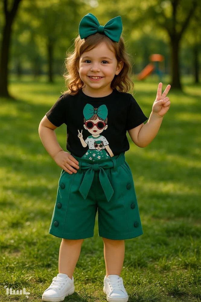ست کراپ و شلوارک دخترانه سایز 45/50در رنگ سبز جنس کراپ دورس جنس شلوارک مازراتی
