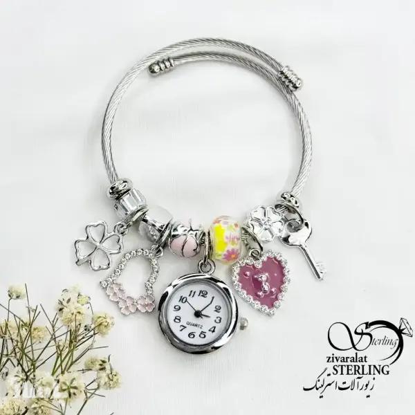 دستبند النگویی پاندورا با آویز ساعت و قلب کد 18790