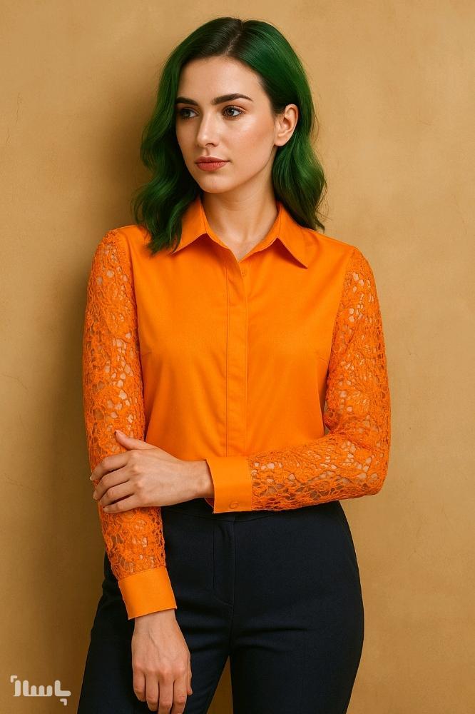 شومیز نارنجی مجلسی زنانه آستین دانتل گیپور