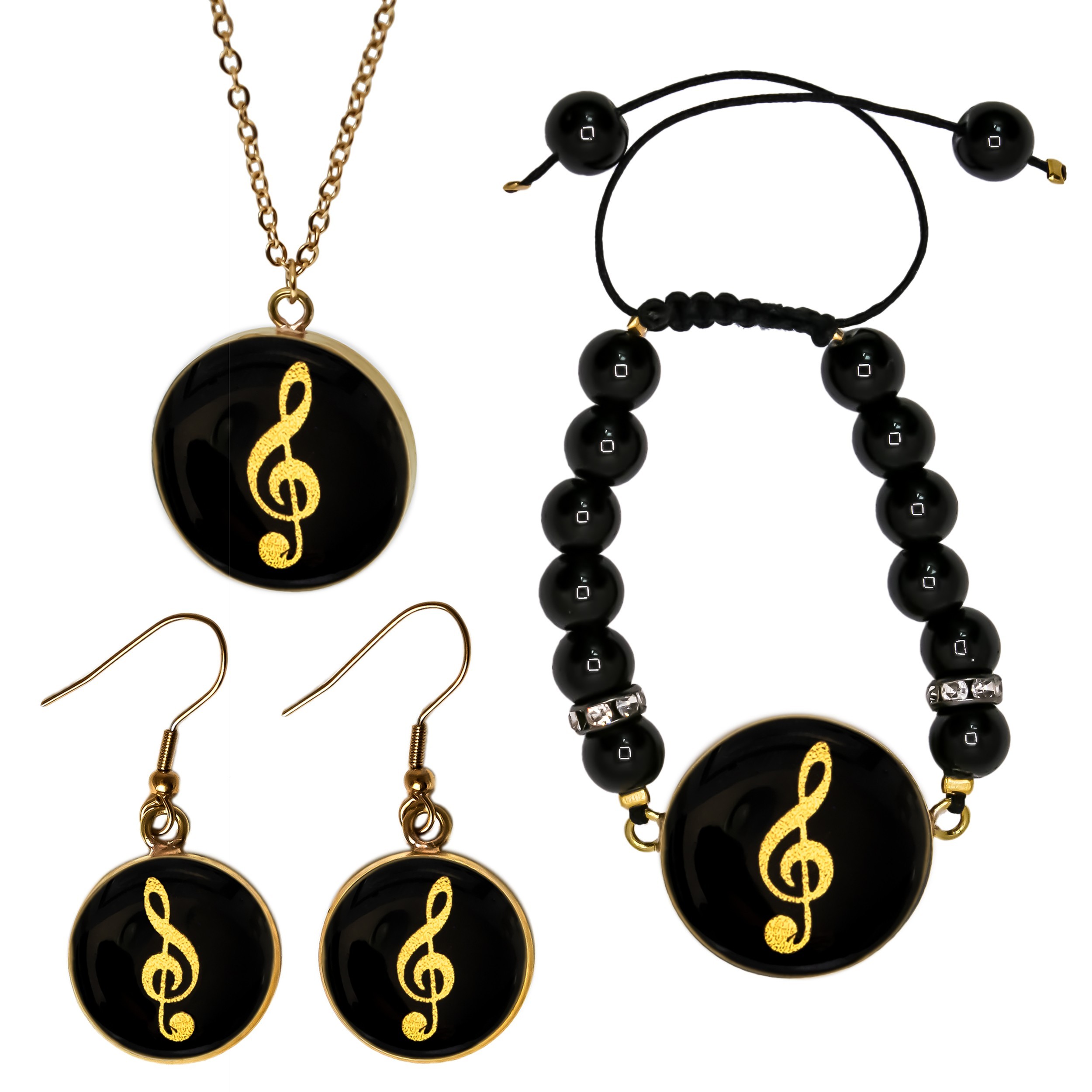 این نیمست زیبا و منحصر بهفرد شامل گردنبند، دستبند و گوشوارههایی است که با دقت و ظرافت از بهترین مواد ساخته شدهاند. هر قطعه از این نیمست دارای پلاک دایرهای مشکی با نماد طلایی کلید سل در مرکز آن است که جلوهای خاص و دلانگیز به این ست بخشیده است.