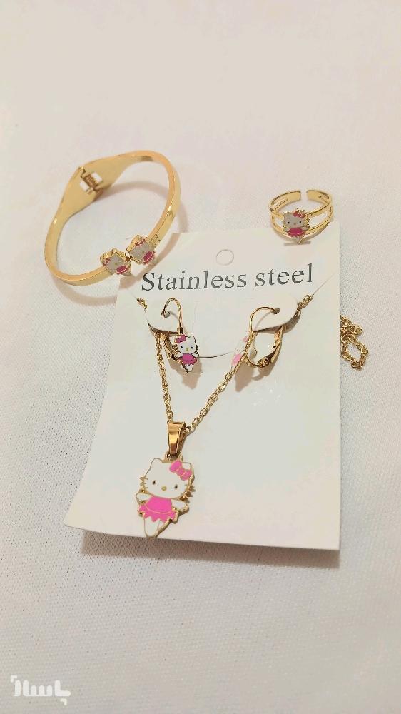 این ست فانتزی شامل گردنبند، گوشواره، انگشتر و النگو هست که همگی از جنس استیل رنگ ثابت و ضد حساسیت ساخته شدن