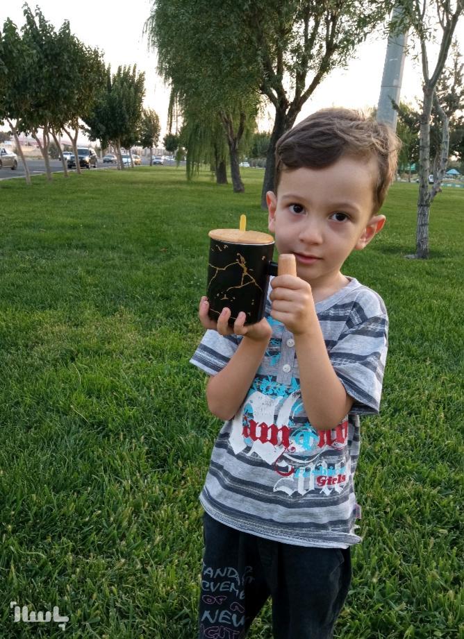ماگ سرامیکی با درب و دسته چوب بامبو به همراه قاشق استیل
