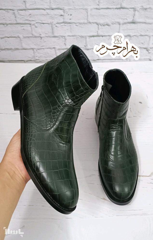 نیم بوت مردانه مجلسی چرم طبیعی دستدوز مدل آلپاین کروکودیلی یشمی