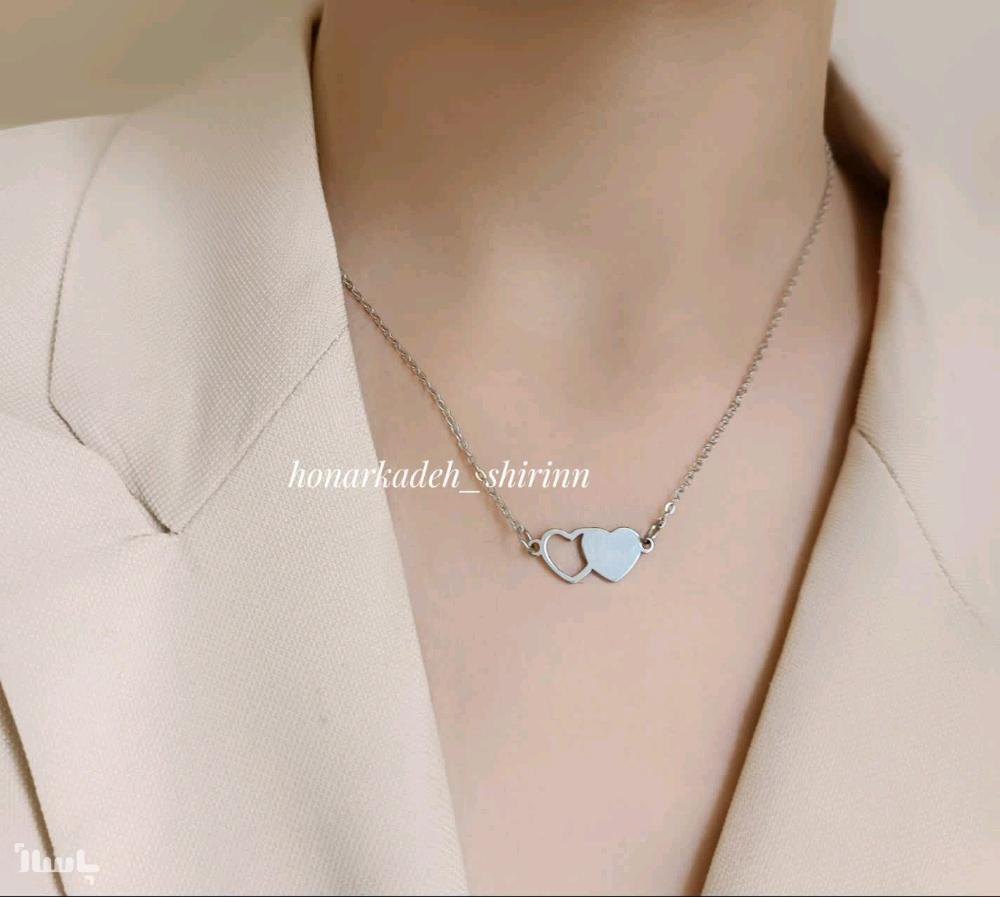 گردنبند استیل و رنگ ثابت نقره ای دو قلب