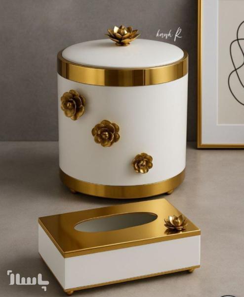 سرویس سطل و دستمال سفید طلایی | بدنه فلزی و استیل ضد زنگ | طراحی لوکس و مدرن ارسال پس کرایهsh