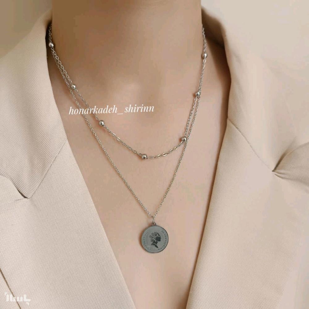 گردنبند استیل و رنگ ثابت دو ریفه با پلاک الیزابت رنگ نقره ای