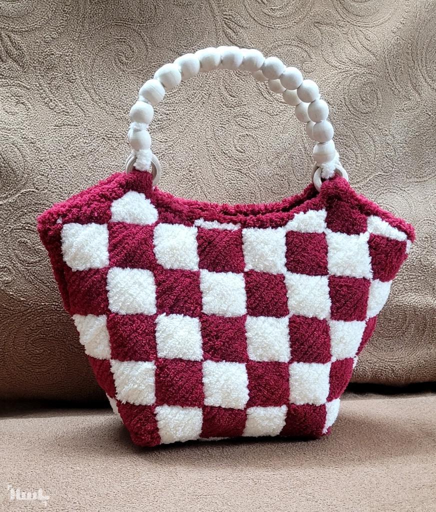 کیف سبدی طرح شطرنجی دستبافت رنگ کرم و زرشکی